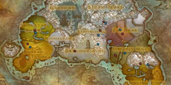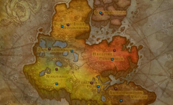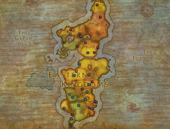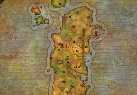 3、下圖中藍點為聯盟陣營、紅點為部落陣營、紫點為雙陣營、黃點為陣營主城的篝火。